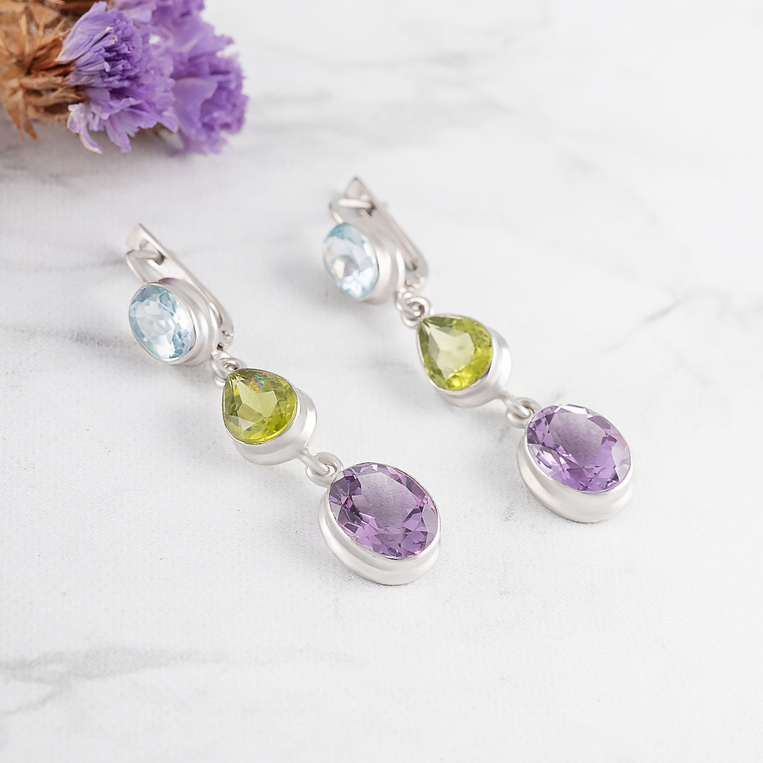 Серьги из серебра с хризолитом, топазом, аметистом