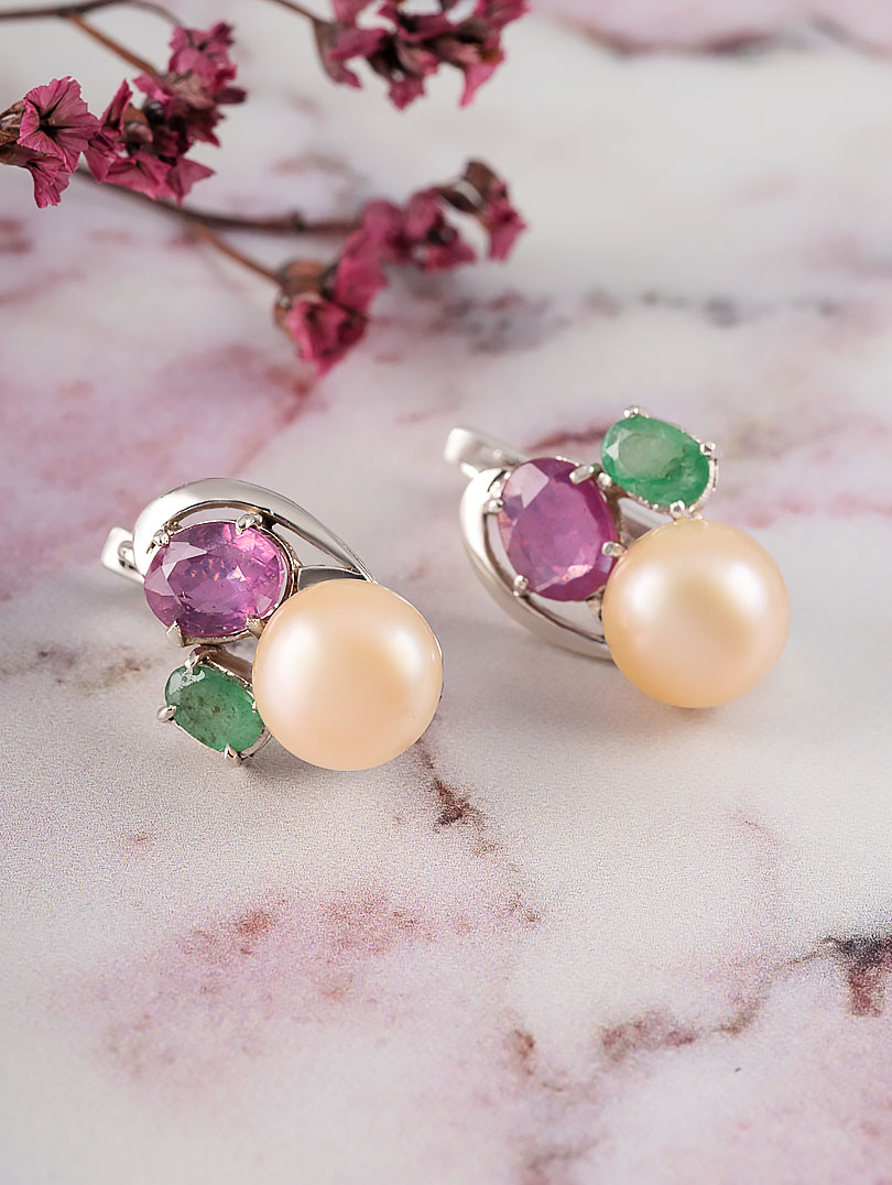 Серьги из серебра с изумрудом, рубином, жемчугом