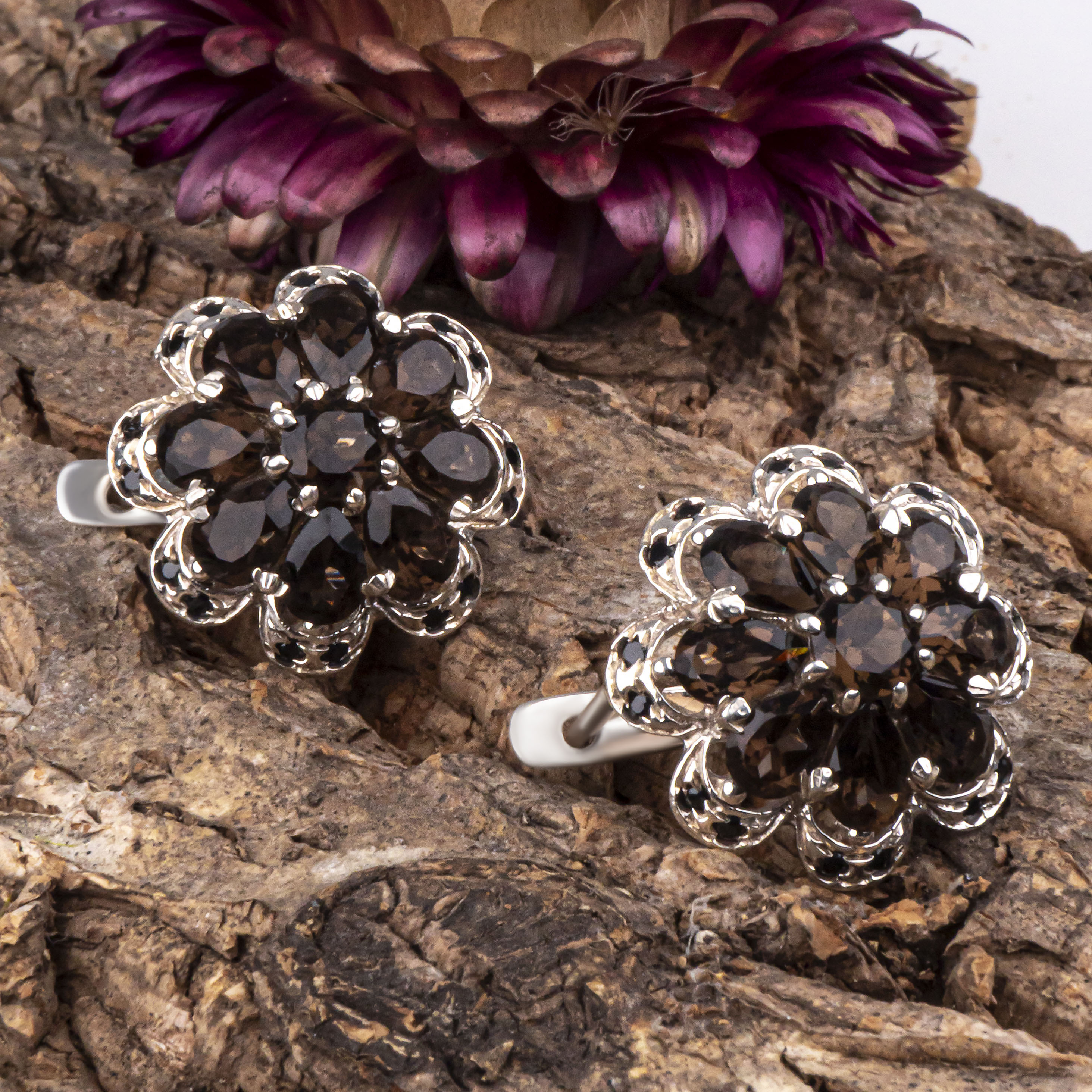 Серьги из серебра с ониксом, раухтопазом (дымчатый кварц)