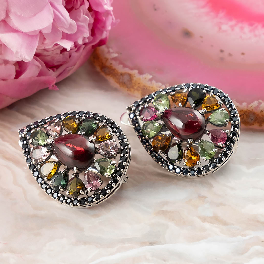 Серьги из серебра с ониксом, турмалином, гранатом