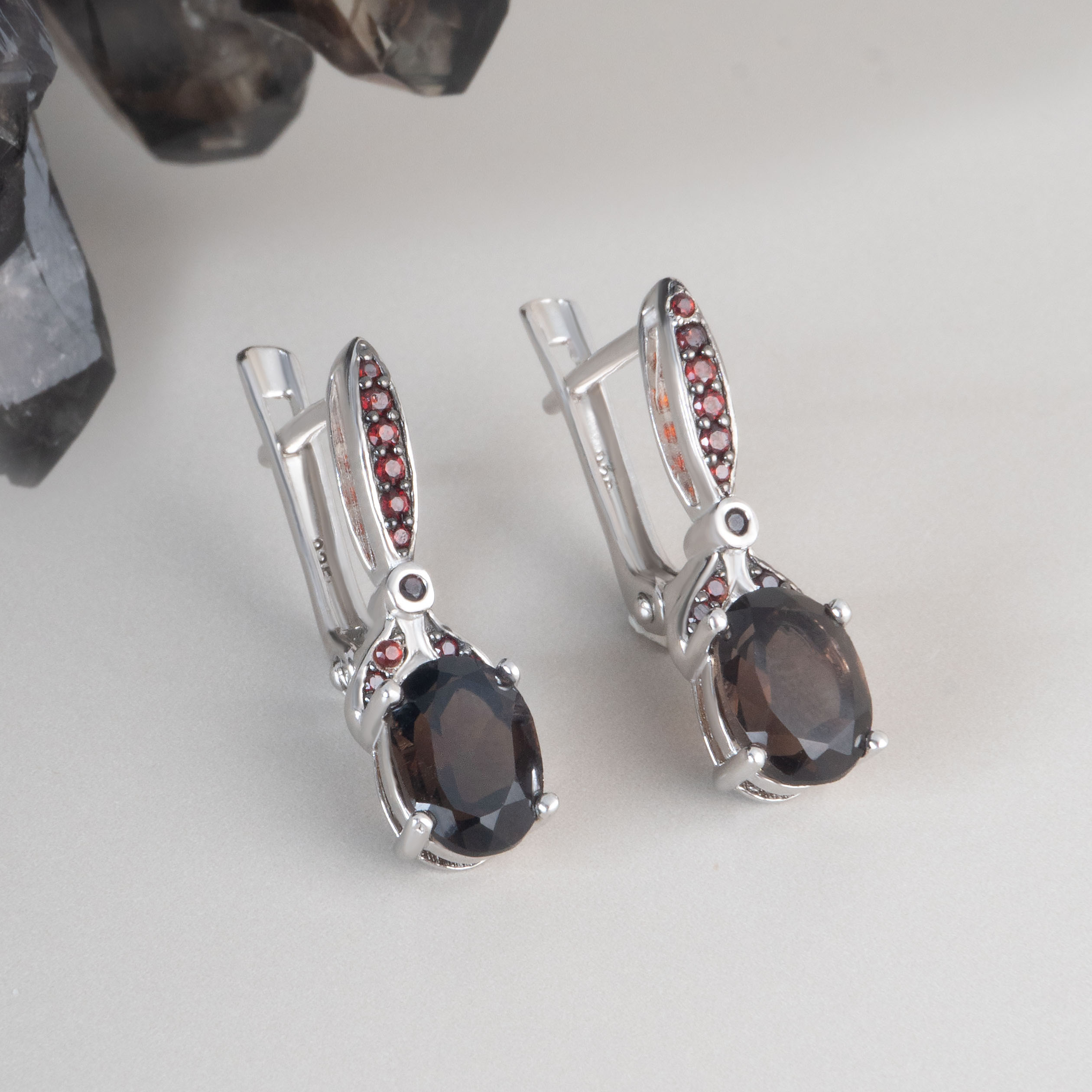 Серьги из серебра с гранатом, раухтопазом (дымчатый кварц)