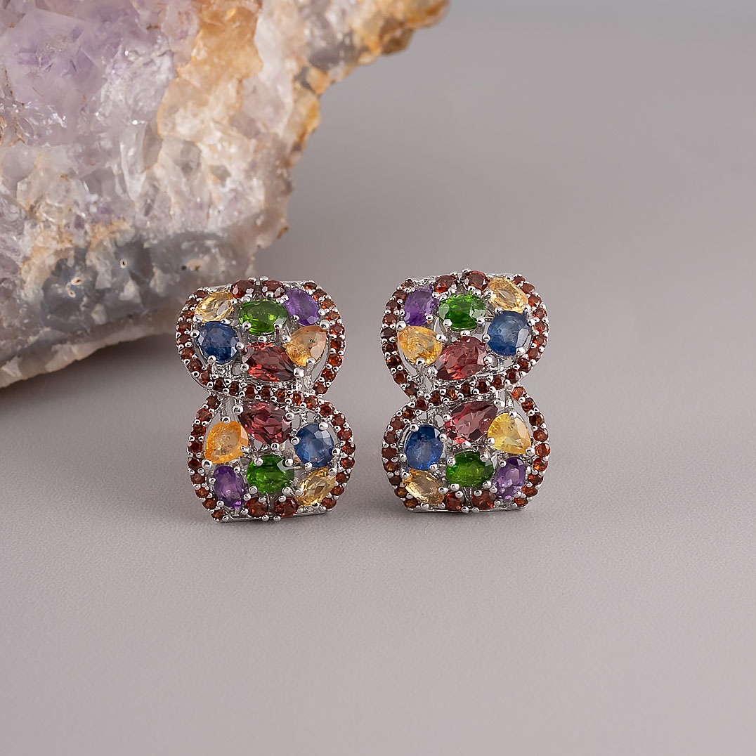 Серьги из серебра с цитрином, гранатом, аметистом, хромдиопсидом, танзанитом