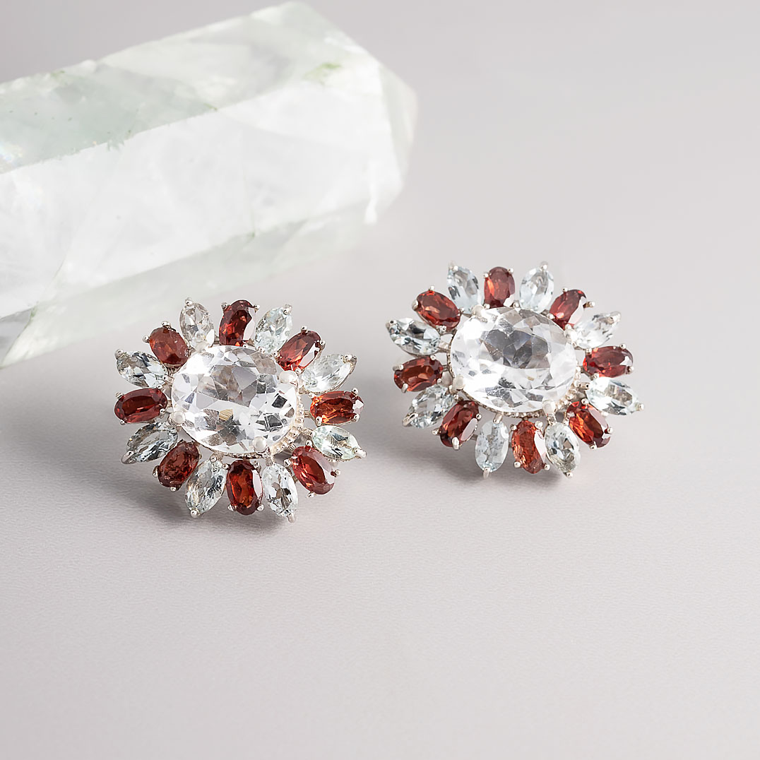 Серьги из серебра с аквамарином, гранатом, горным хрусталём