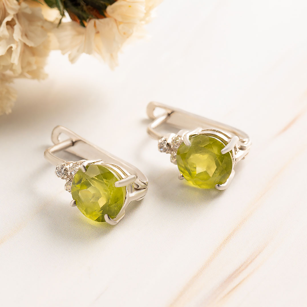 Серьги из серебра с хризолитом, фианитом