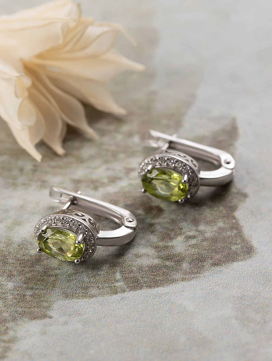 Серьги из серебра с хризолитом, фианитом