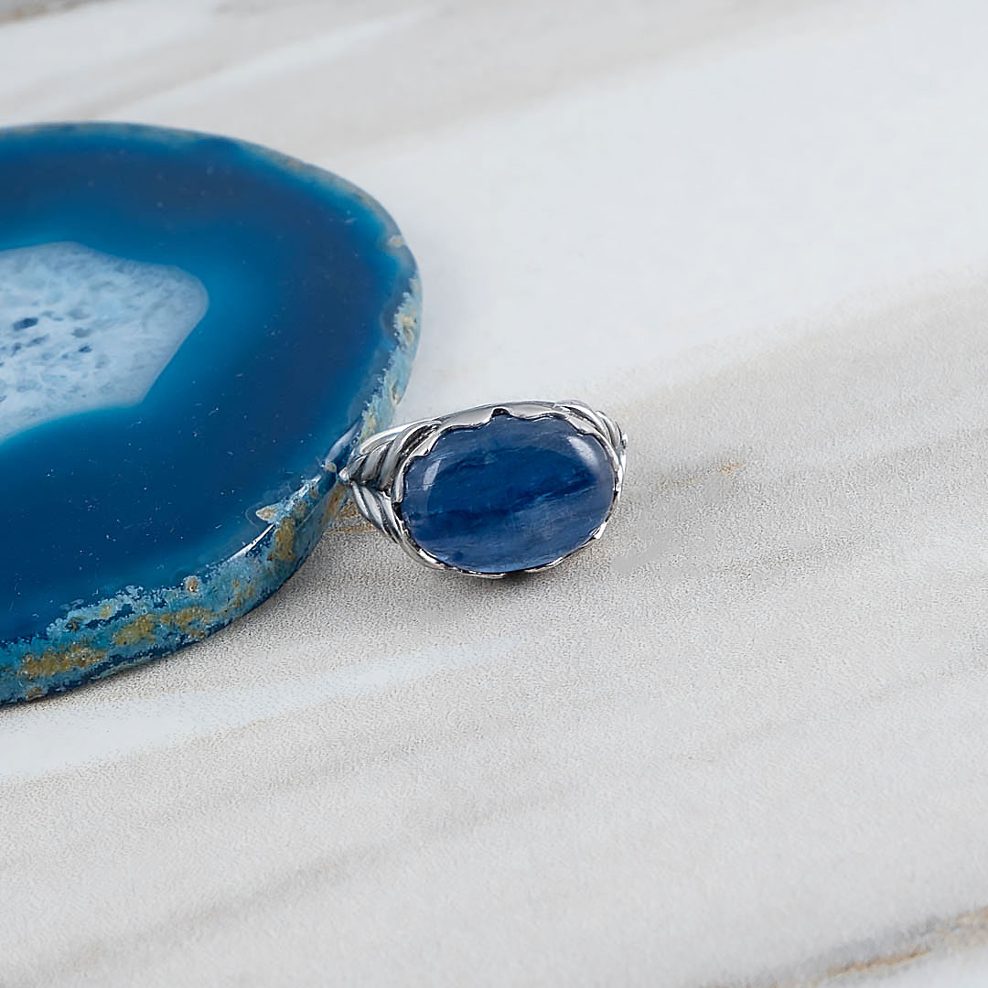 Кианит привлекает своим насыщенным цветом и необычной “слоистой“ структурой, делающей его похожим на леденец. Название произошло от греческого “kyanos“ - “синий“, и действительно, чаще всего этот камень радует глаз всеми оттенками океанической волны: от глубокой синевы до нежной лазури. Прозрачные кианиты поэтому можно принять за сапфиры. Однако, встречаются и желтые, и зеленые, похожие на изумруды, камни. Особенно красив кианит в серебре - глубокий синий цвет отлично гармонирует с холодностью белого металла.
